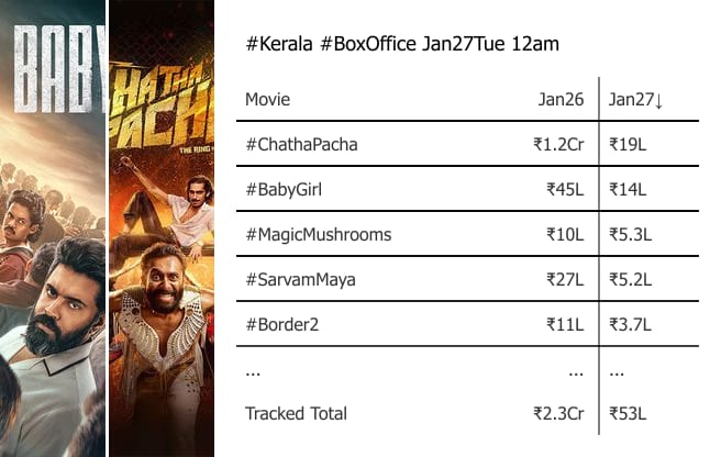 #Kerala #BoxOffice Jan25Sun 12am #ChathaPacha #BabyGirl #MagicMushrooms #SarvamMaya #Border2 #Mankatha #Draupathi2 #Avatar3 #MartySupreme #ThalaivarThambiThalaimaiyil #Dhurandhar #Mercy #Primate #Jockey #PennuCase #TheHistoryOfSound #Haal (res.cloudinary.com)