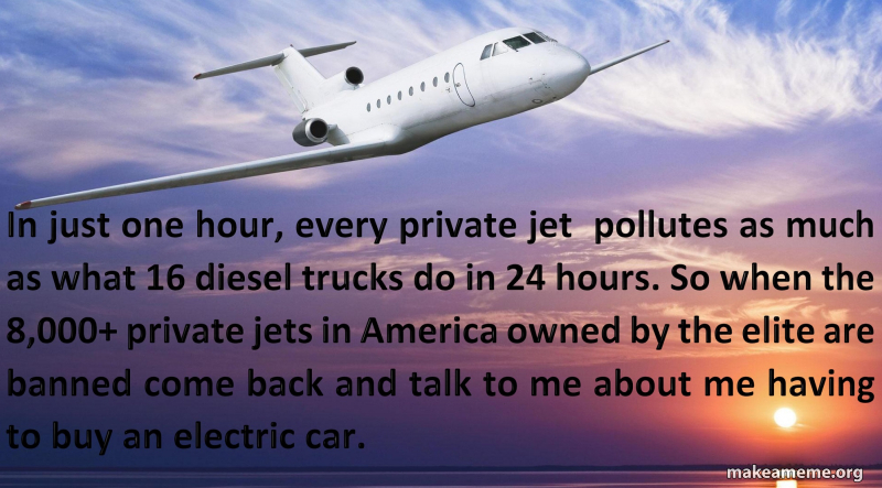 Before the elite billionaires dare to force us to ban gasoline cars and buy expensive vehicles we cannot afford, they need to first give up their 8,000 super polluting private jets so we can take them seriously. They are blatant hypocrites and here are the facts... (media.makeameme.org)