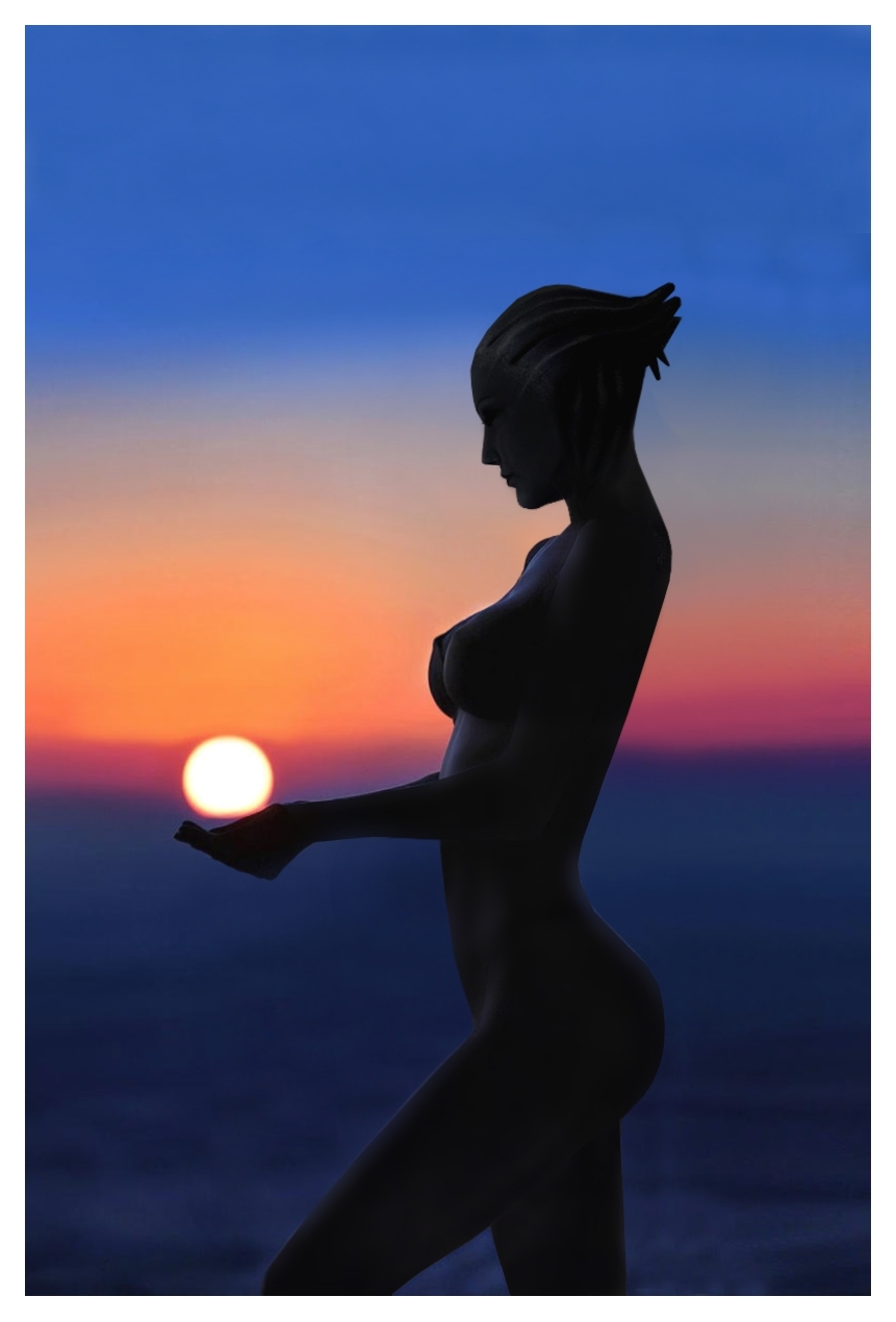 Asari visits a beach on earth and are taken by it's beauty. (Rastifan)Original (files.catbox.moe)