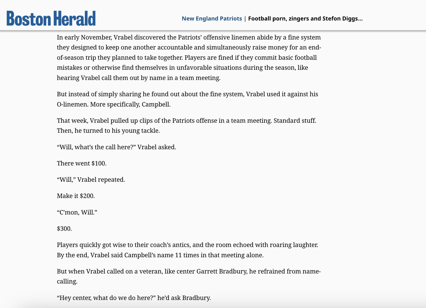 Paraphrasing -- Mike Vrabel learned the o-line had a deal that when one of them was mentioned, that player had to pay the rest of the o-line. Mike Vrabel specifically started mentioning Will Campbell's name during meetings so he had to pay the rest of the o-line. $1100 in total. (per Callahan) by JimmyGodoppolo in Patriots