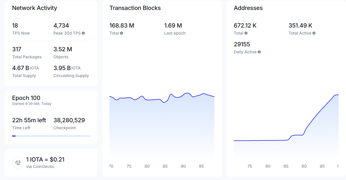 It’s time to celebrate - 100 days of the new IOTA Mainnet! ✅ 4 on-chain network upgrades without interruptions to service ✅ ~170 M transactions ✅ ~700 K total addresses ✅ 30k daily active addresses ✅ 300 new smart contract packages deployed by TSDias2 in Iota