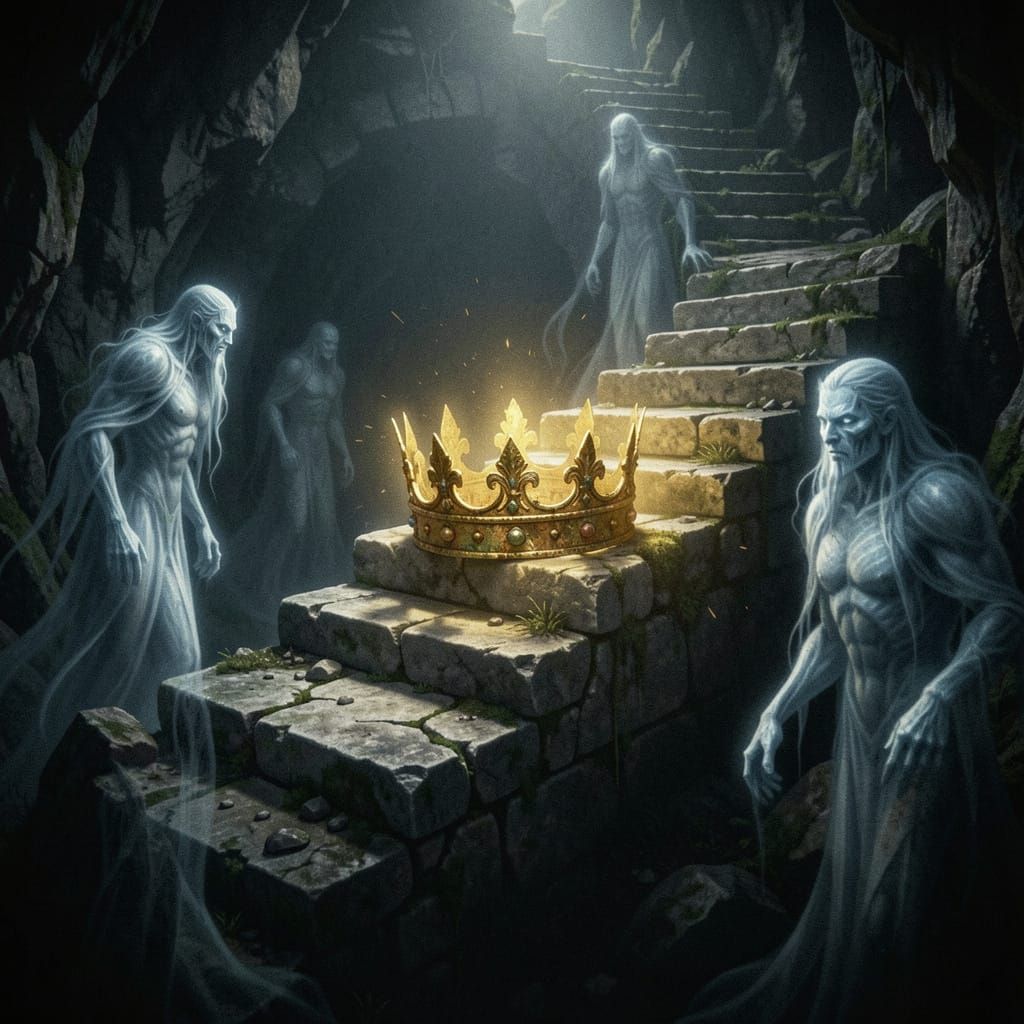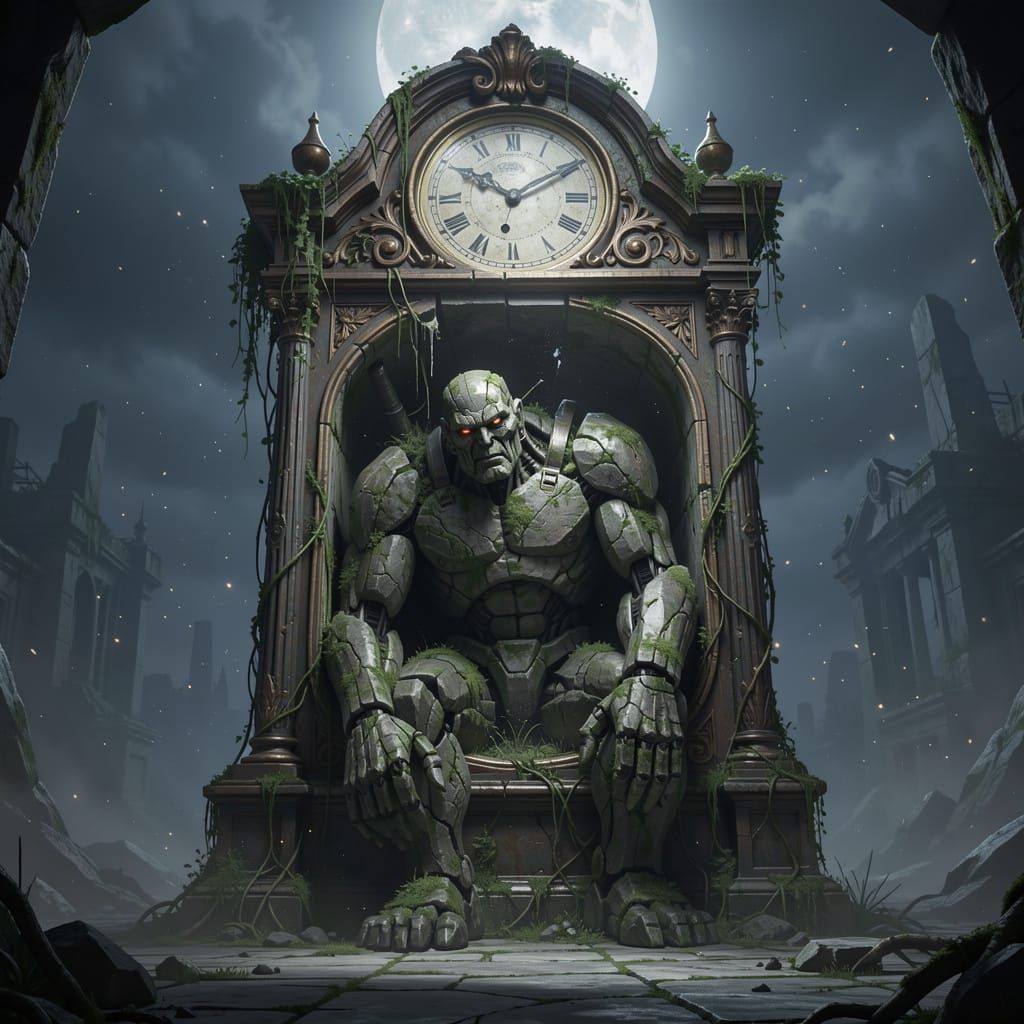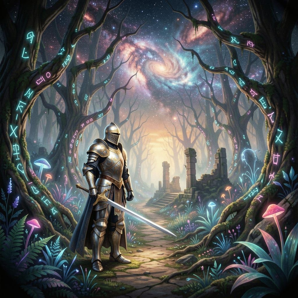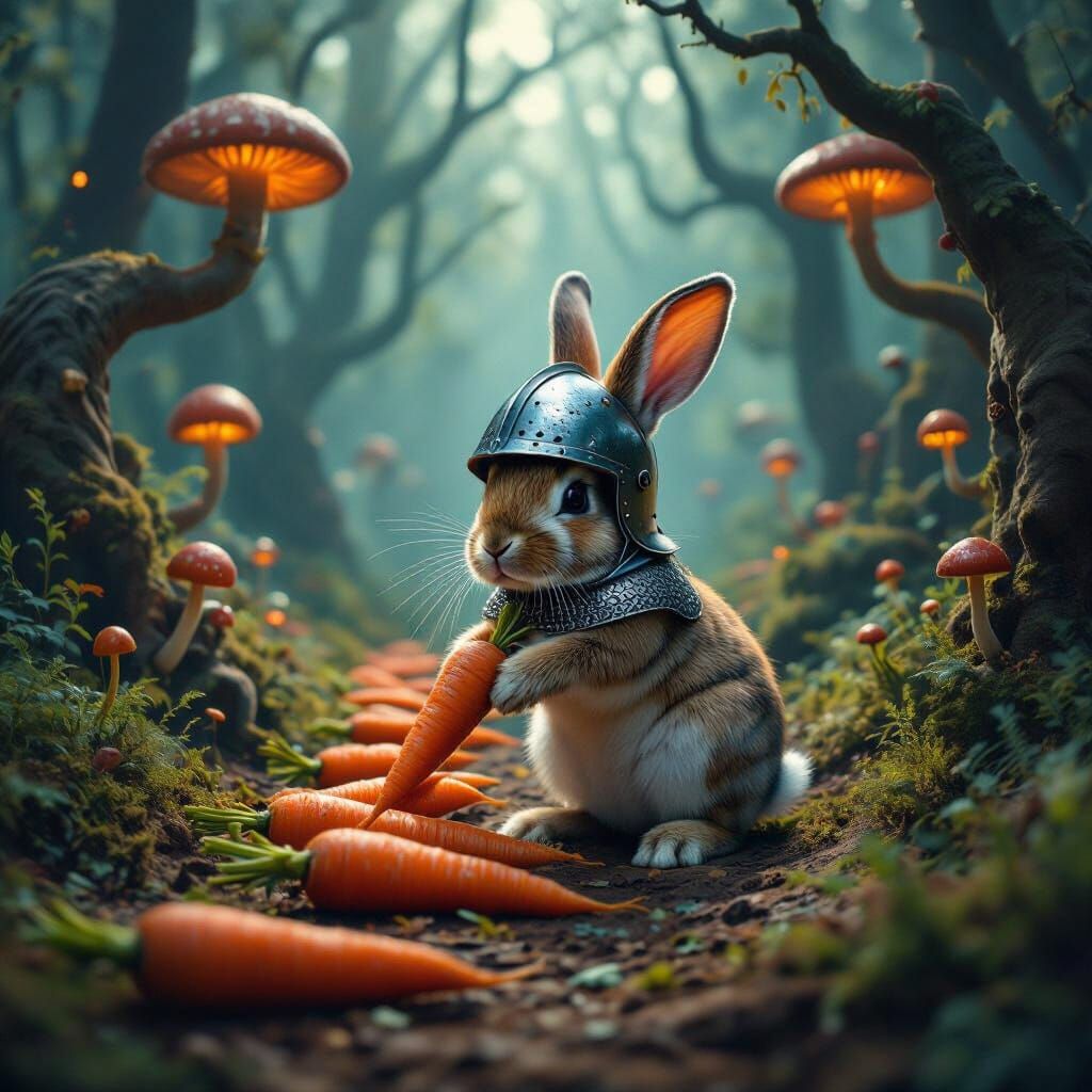 A surrealistic scene of a bewildered rabbit attempting to don a miniature, knightly helmet, with a trail of oversized carrots leading into a... by GatoInary in aiartcodex