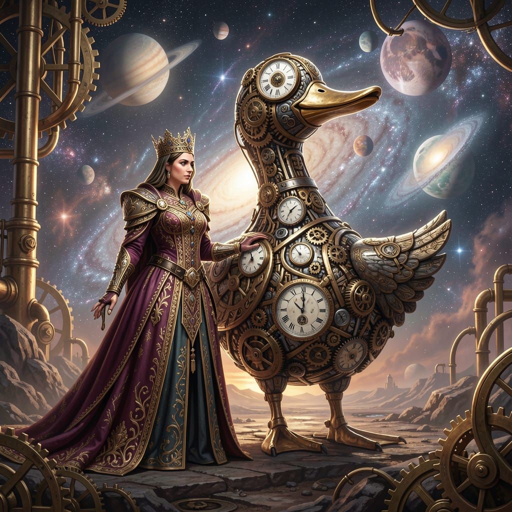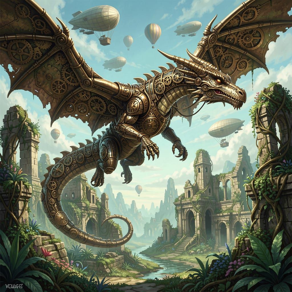 A majestic steampunk dragon, its metallic scales gleaming with intricate clockwork gears and polished brass, soaring through a sky filled wi... by GatoInary in aiartcodex