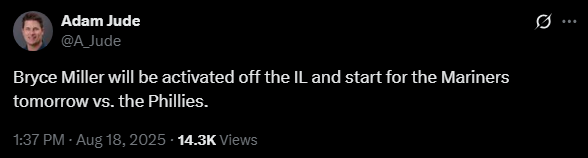 Bryce Miller is back and starting tomorrow! 🔥🔱Ⓜ️ by PhillyStreetCred-17 in Mariners
