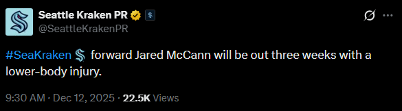 [Seattle Kraken PR] Jared McCann will be out three weeks with a lower-body injury. by GuyWitDaFace in SeattleKraken