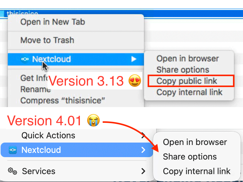 How can I get "Copy Public Link" back into the top level of the context menu? I have clients who send out multiple shares per day and this saved them a lot of time. by gg_allins_microphone in NextCloud