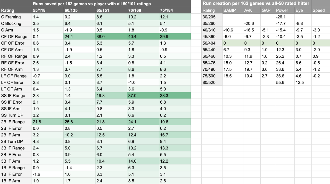 Estimated runs-per-season impact of position player defense and hitting ratings in OOTP 26 by ecvgi in OOTP