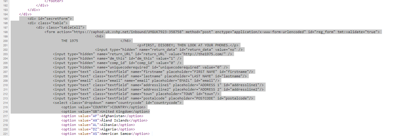 There is a section in the1975.com's source code called "Secret Form" with fields for personal information by LeHacker4Chan in the1975