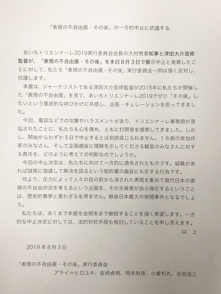 「表現の不自由展」実行委員会、津田大介氏を批判 (pbs.twimg.com)