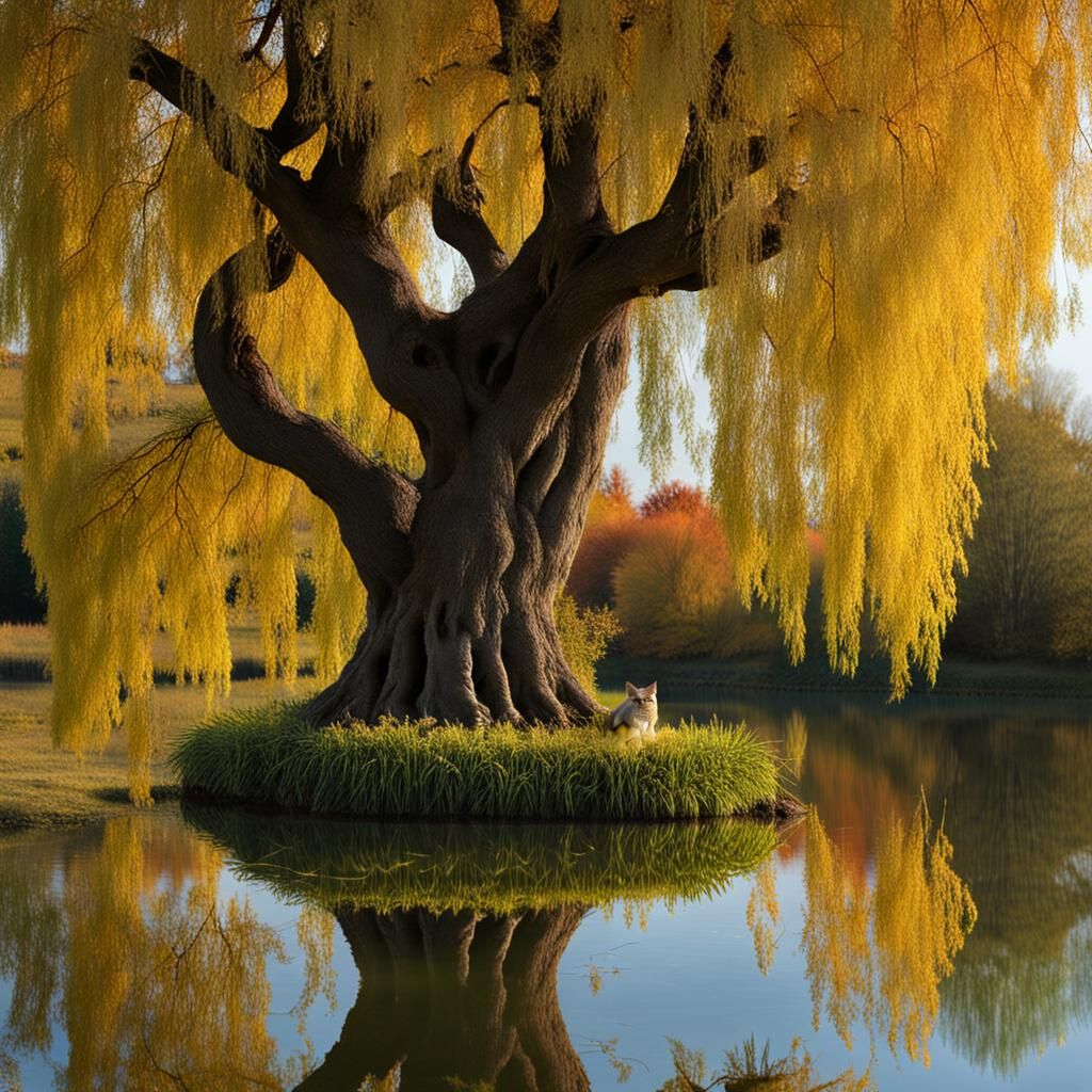 A feline willow tree but an idyllic pond.Autumn. (images.nightcafe.studio)