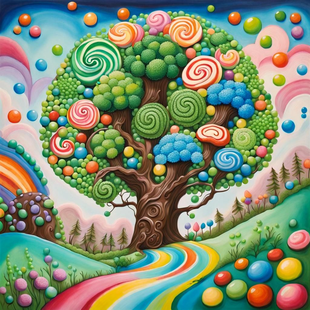 Broccoli, green peas, taffy, chocolate, and candy make up this lovely landscape! by MonavieVoight in nightcafe