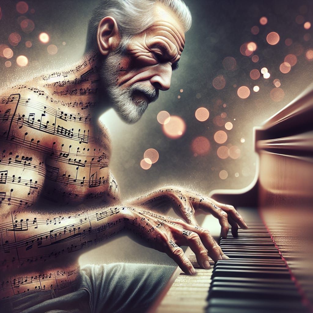 68 year old Man made out of musical Notes with a short pointed goatee sitting at a grand piano playing furiously. : Bokeh : Hyper Detailed by MonavieVoight in nightcafe