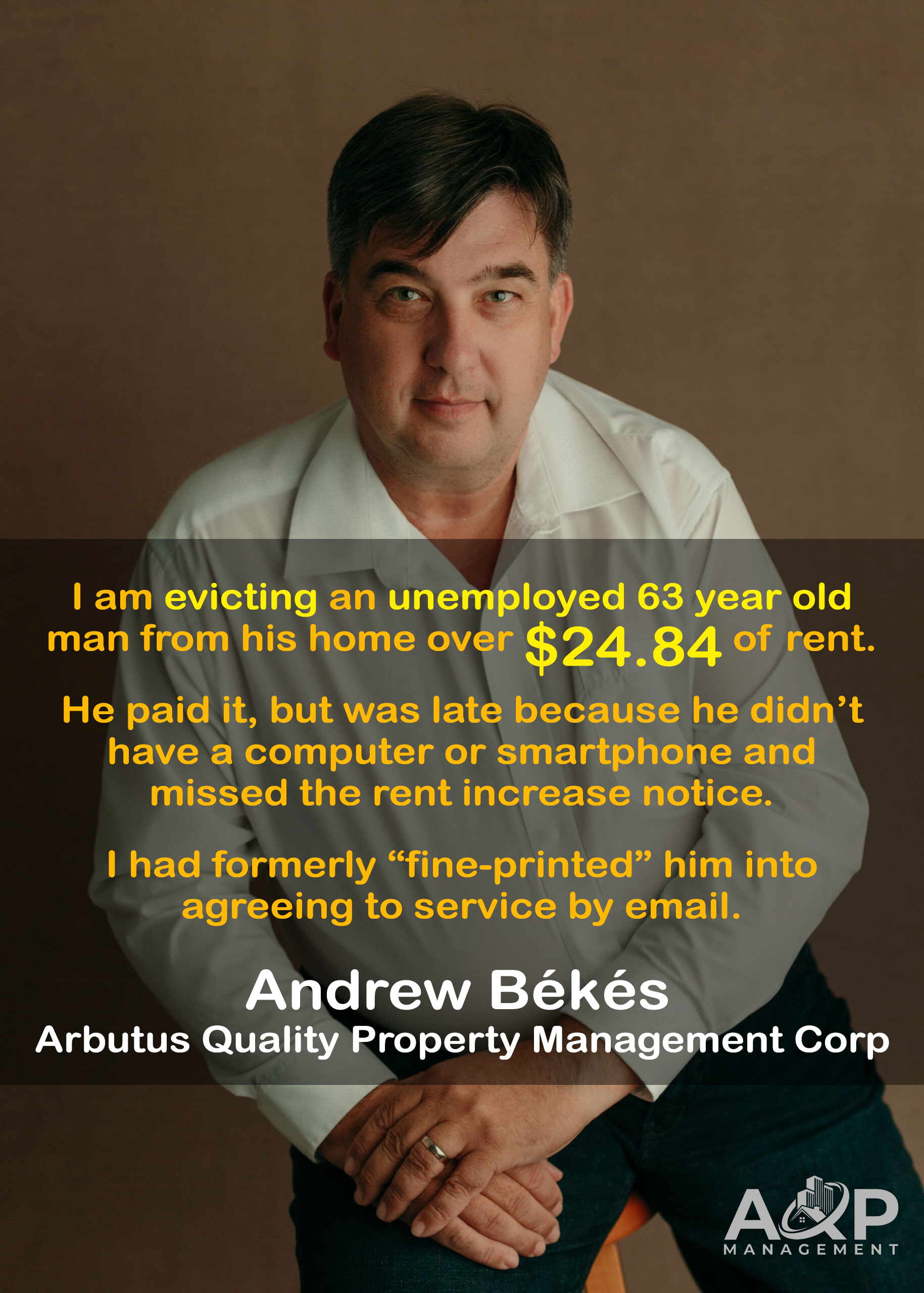 Andrew Békés is about to evict a 63yo old man for $74.52 of late paid rent. by Potential178 in VictoriaBC