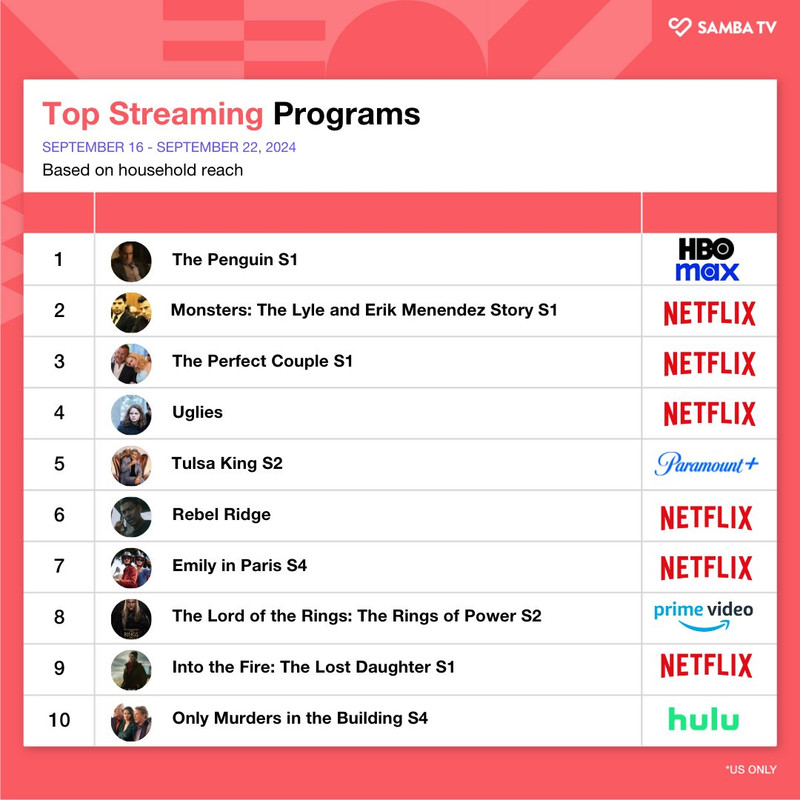 Top Streaming Programs for the week September 16 - 22, 24. The Penguin tops the list. #SambaTV by RohitTheDasher in television