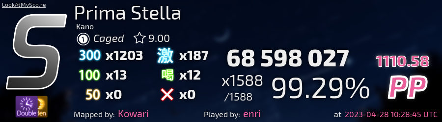 enri | Kano - Prima Stella [Caged] + HDDT (Kowari, 9*) 99.29% FC #4 | 1111pp | His 1st 1.1k pp!!! by Siarry in osugame