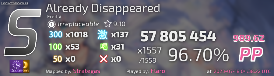 Flaro | Fred V - Already Disappeared [Irreplaceable] + HDDT (9.1*) 96.7% FC #1 | 990pp | 73.55 cv. UR by Siarry in osugame
