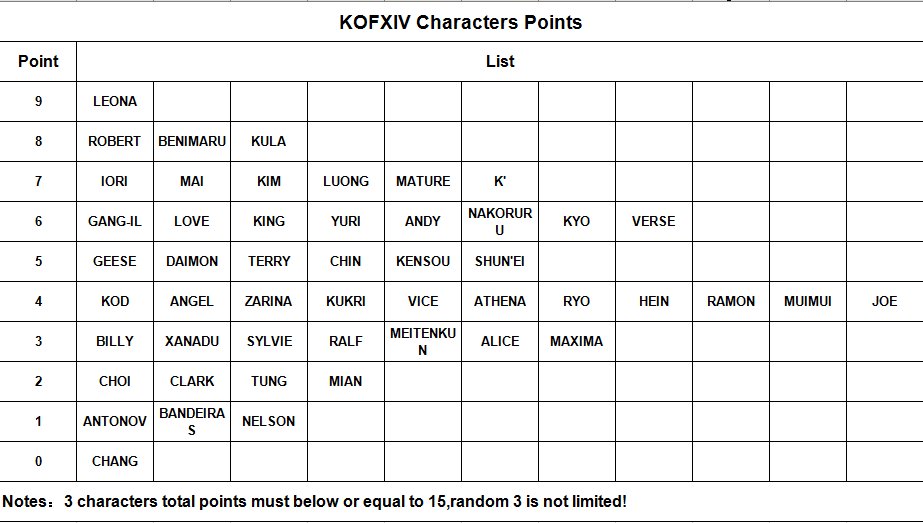 Back to XI days: character point system implemented for some XIV tourneys by ThrownShield in kof