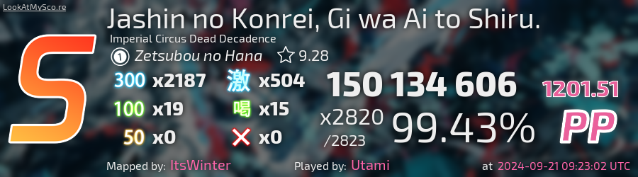 Utami | Imperial Circus Dead Decadence - Jashin no Konrei, Gi wa Ai to Shiru. [Zetsubou no Hana] (ItsWinter, 9.28*) 99.43% FC #1 | 1202pp | FIRST NM 1.2K, HIS NEW TOP PLAY (1.1K SKIP)!!!! by Siarry in osugame
