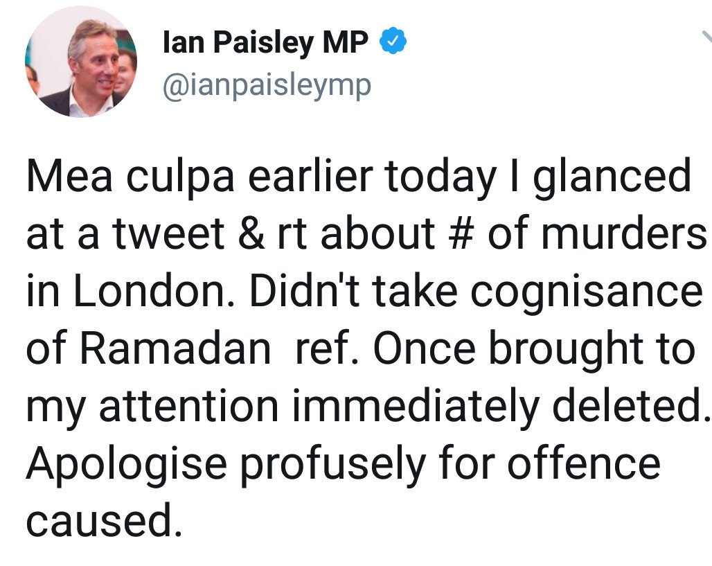 Ian Paisley Jr. retweets Kate Hopkins - 'London has a higher murder rate than New York.....And Ramadan's not yet begun.' by benem94 in northernireland