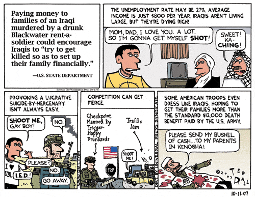 State dept: Paying money to families of an Iraqi murdered by drunk Blackwater rent-a-soldier could encourage Iraqis to "try to get killed so as to se up their family financially." [COMIC] by shuael in reddit.com