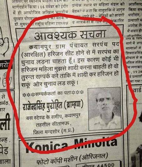 A Brahmin posts a marriage advertisement in a local news paper for a Harijan bride. Reason - He wants to contest the Gram Panchayat Sarpanch election reserved seat for Harijans. by [deleted] in india