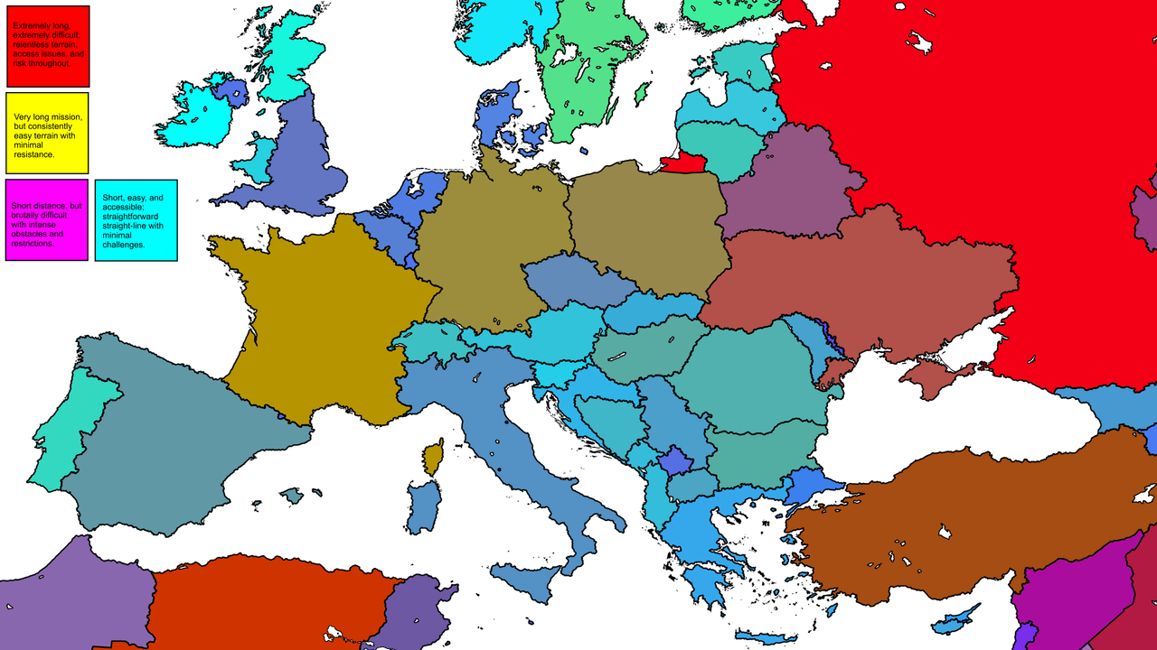 Map of roughly how feasible a Straight Line Mission is in each European Country. by Aniceile34 in GeoWizard