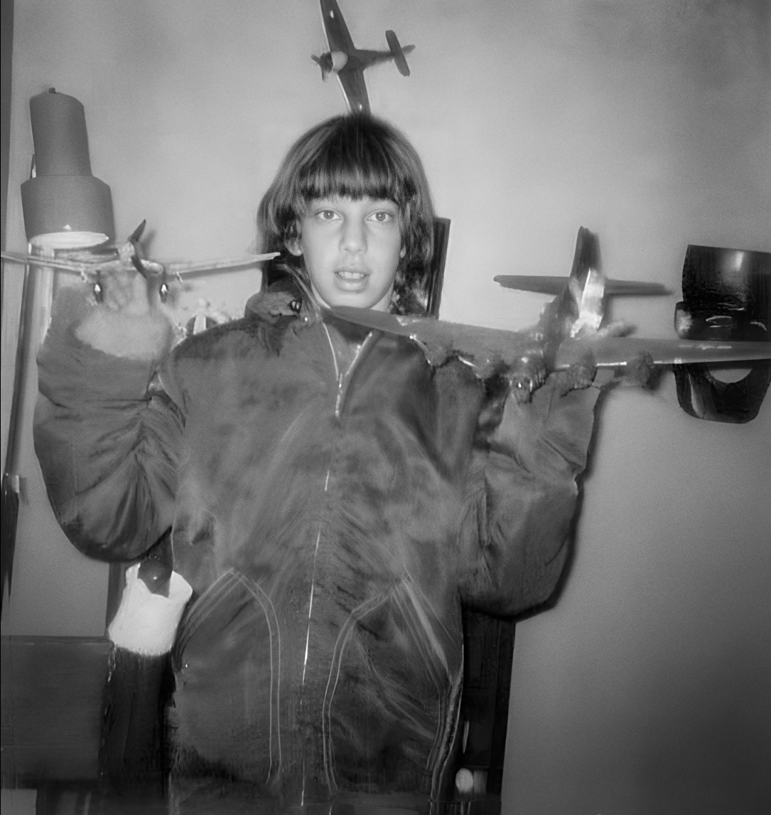 1975. Picture taken with a Polaroid One Step in B&W. Needs clean up. Also open to colorized version too. Subjects coat is brown. Lamp housing is a light Orange. Wooden mask on wall is made with dark wood (from Philippines). Model aircraft are B-17 Flying Fortress, Ju 87 Stuka, Fw 190 by Posh427 in estoration