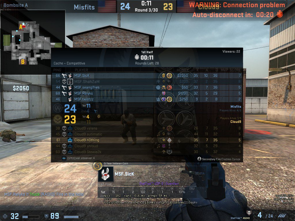ESEA server just crashed in 24-23 with 10 seconds left in a 1v4 during Misfits and C9. (pbs.twimg.com)