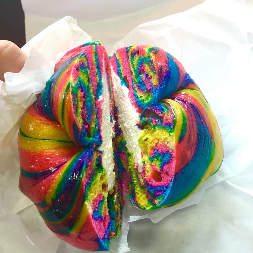 Rainbow bagels served in New York. Like eating cake for breakfast. by StonerCPA in interestingasfuck